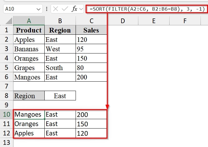 ➥ SORT(..., 3, -1) → Sorts the filtered results by the 3rd column (Sales) in descending order.