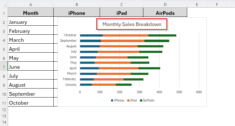 ➤ Excel will insert a stacked bar chart with months on the horizontal axis and product sales stacked by category.