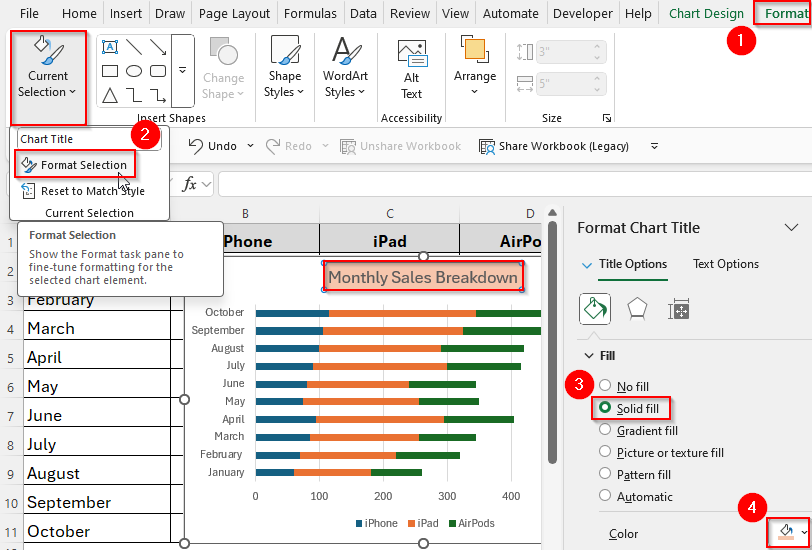 ➤ To change a color, go to Format → Format Selection → Fill → Solid Fill. Then, you can simply pick a new color that’s brighter or more distinct. You can also repeat this step for each category until your chart looks clear and colorful.