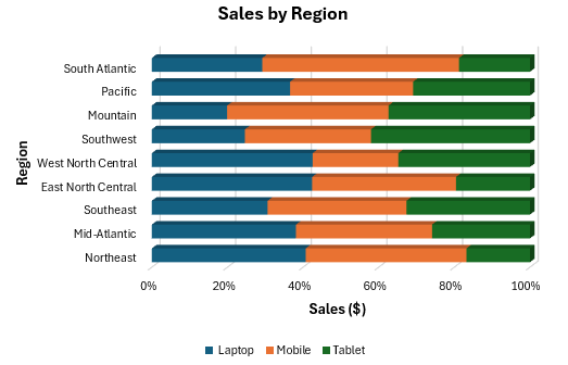 ➤ Excel will generate a chart with regions on the vertical axis and three bars (Laptop, Mobile, Tablet) per region.