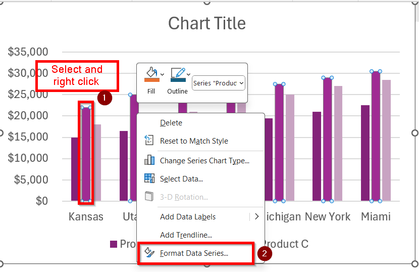➤ If you want to manually customize any single column of the chart, select that specific column and right click on your mouse. For example, we are choosing the middle column of Product B to format manually.