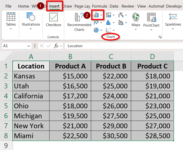 This is the most popular and approachable method for beginners. When your dataset is already structured in a worksheet, this method is the best. You may directly access all chart types and customization settings in one location by utilizing the Ribbon. For those who like complete control over chart selection from the start and don’t want to rely on Excel’s built-in recommendations, this approach is ideal.