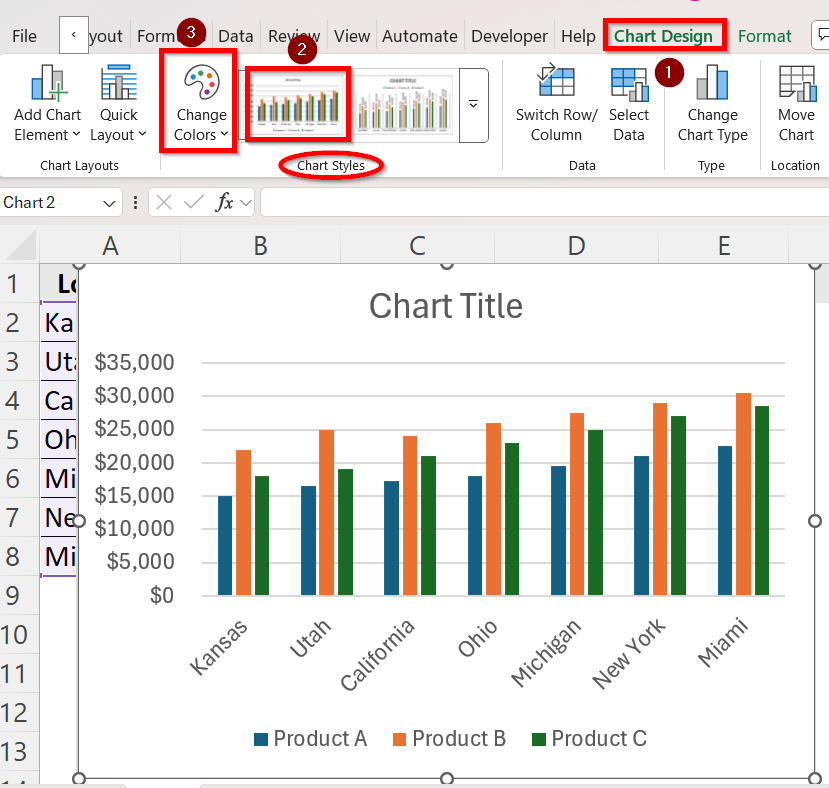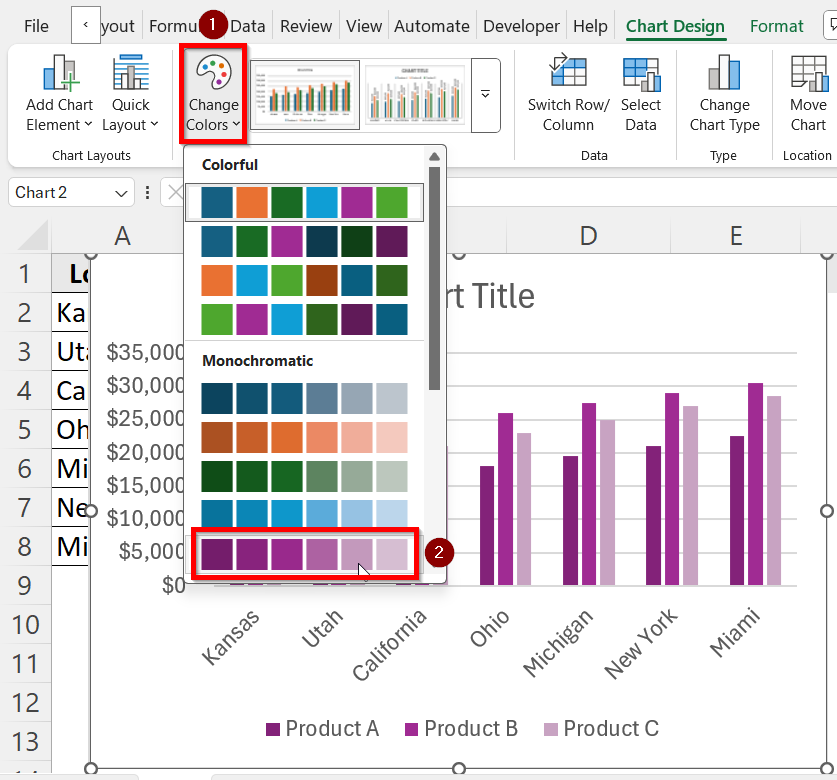 ➤ Click on Change Colors option to give the chart columns new colour schemes.