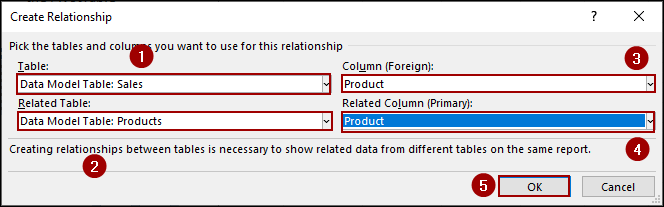 In the Create Relationship dialog box, you will define the connection between your “Sales” and “Products” tables.
