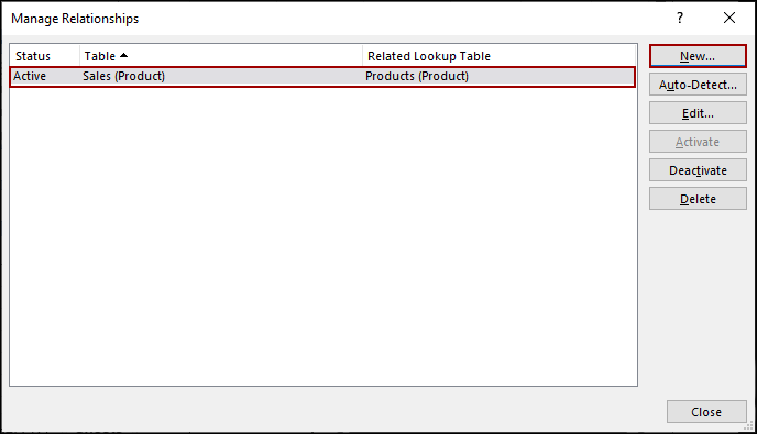 This way, the first relationship (Sales (Product) > Products (Product)) will be added to the Manage Relationships dialog box.