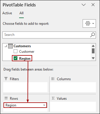 ➤ From the Customers table, drag the Region field to the Rows area.