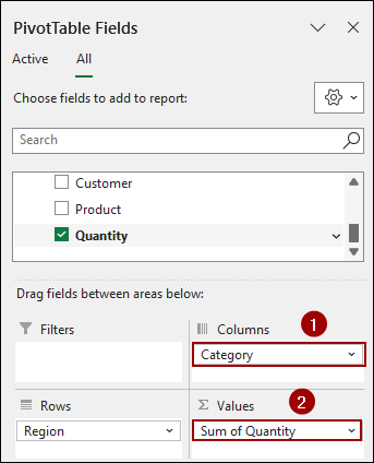 ➤ Similarly, from the Products table, drag the Category field to the Columns area.