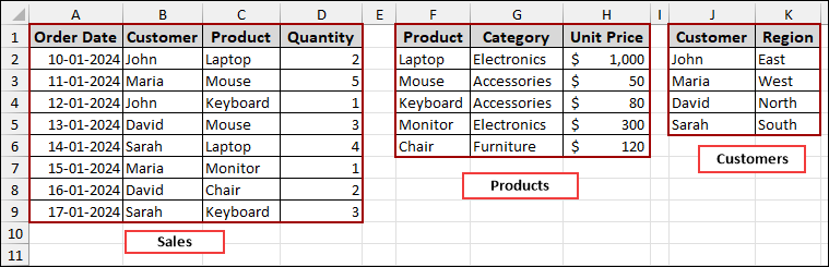 Suppose we have data for “Sales”, “Products”, and “Customers” spread across our sheet. Now, we will prepare the data first and then create data model relationships for these three types of data.