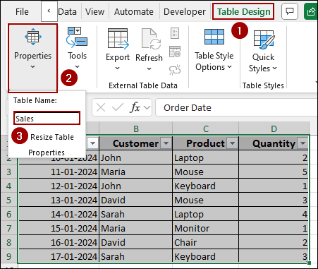 ➤ Choose any cell inside your newly created Sales table and click on the Table Design tab from the menu bar.