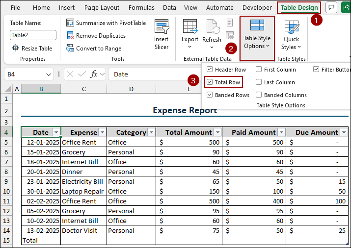➤ Activate the Total Row feature to calculate the total expenses and thus create a complete expense report in Excel.