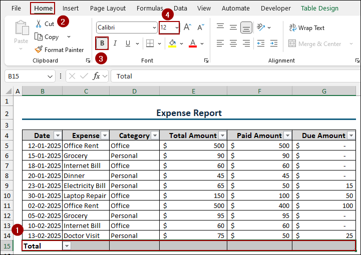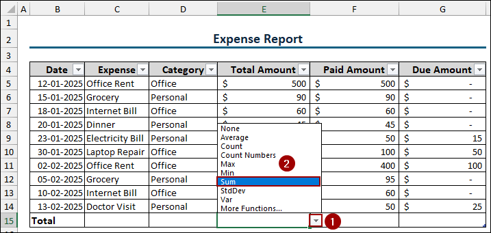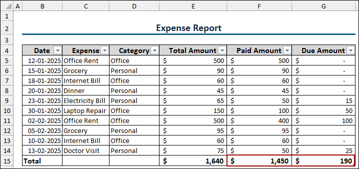 Repeat this for the Paid Amount and Due Amount columns to get the final totals. Finally, we have successfully created an expense report in Excel.