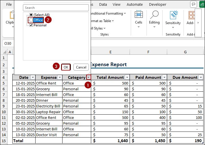 As a result, your expense report now only displays the selected category’s data, and the Total Row summary automatically updates to reflect only the filtered data.