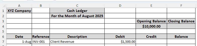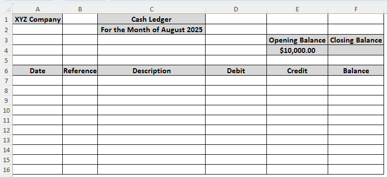 ➤ At the top, we will have the company name, the ledger name, the mention of the month, the opening, and the closing balance. The opening balance should be imported from the last month’s ledger, and we will calculate the closing balance.