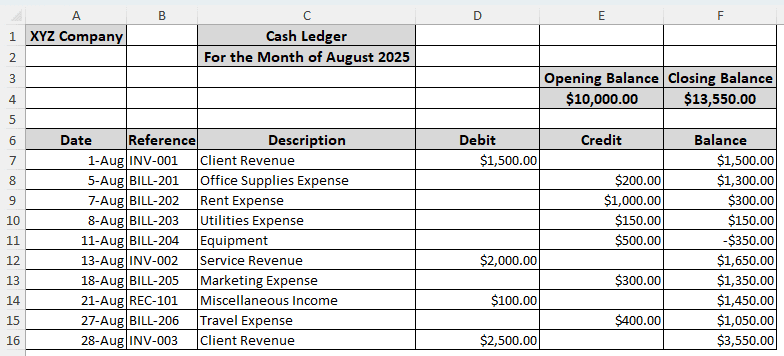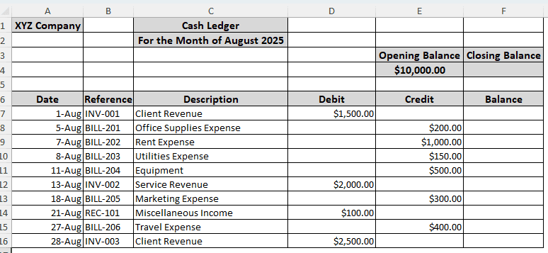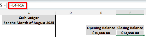 ➤ Use the opening balance for E4 and the ending running balance for F16.