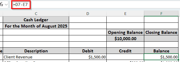 ➤ Replace D7 with the debits and E7 with the credits. If it’s not an asset ledger, the debits and credits will swap places.