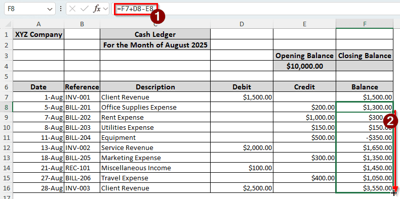 ➤ Calculate the running balance for the rest of the cells using the following formula, and autofill the rows if you need: