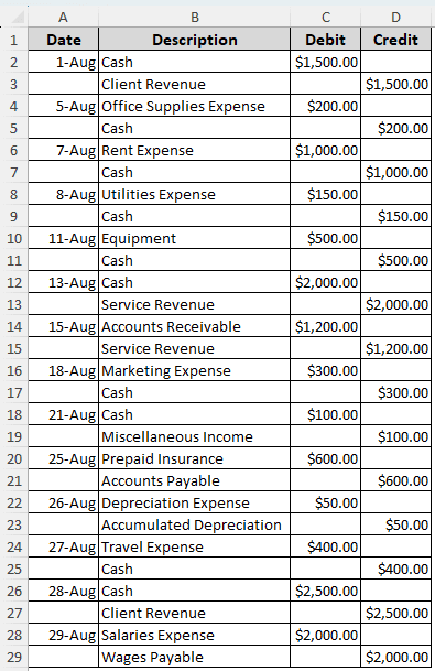 Before starting to make a ledger, we need a journal to import the transactions from. Here, we have the journal for August 2025 with a bunch of transactions. We will make a cash ledger, so we are only interested in the transactions that include cash. Let’s start with the ledger creation process: