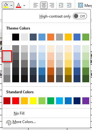 ➤ To color the cells, we go to the font section of the Home tab and select the paint bucket. Then, we choose “White, Background 1, Darker 15” color properties.