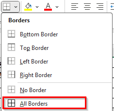 ➤ For the rest of the cells, we enable All Borders from the Borders icon in the Font section of the home tab.