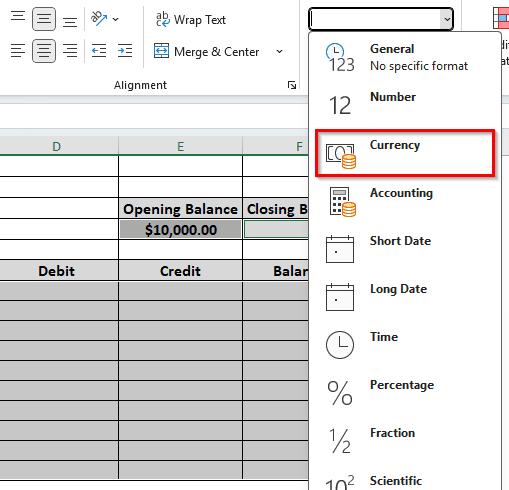 ➤ Now we need to select the cells in the Debit, Credit, and Balance sections, and set them to Currency. To do so, we go to the Number section of the Home tab and open the dropdown menu to select Currency.