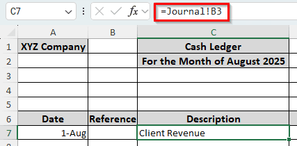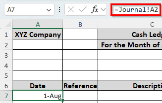 ➤ In the A7 cell, write the following formula to import it from the transaction from the Journal sheet: