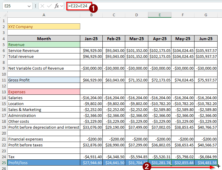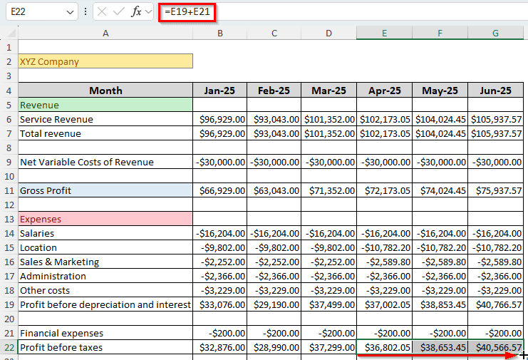 ➤ Insert the following formula to calculate profit before depreciation and interest. Autofill the other months after you enter the formula: