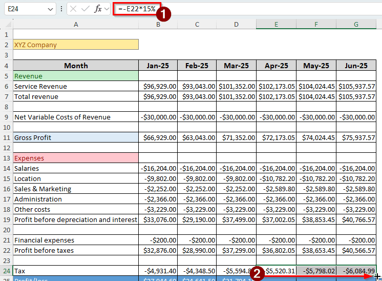 We multiplied the profit before taxes by 15% to calculate the taxes. A minus (-) sign is used before so that the output appears in negative form.