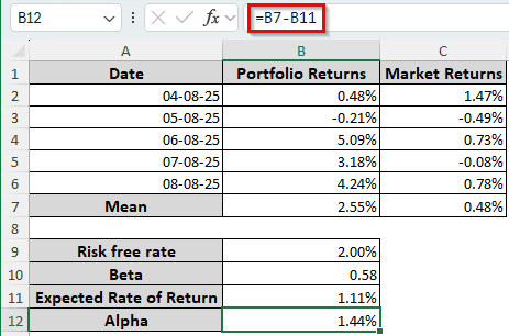 ➤ Finally, put the following formula in the B12 cell to calculate the alpha: