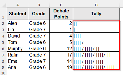 In this code, remember to replace the range (“C2:C9”) with your own data range. Also, if you want to put the tally marks in a column other than D, replace D in Put tally in next column (D) part of the code.
