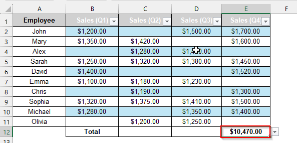 To determine the Q4 sales average and the overall sales average, let’s look at the employee sales dataset below.
