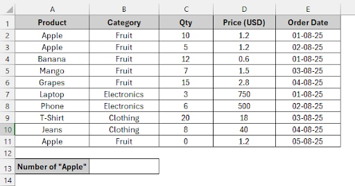 In our dataset, “Apple” is searching in the quantity column with the COUNTIF function, which is why it is returning 0.