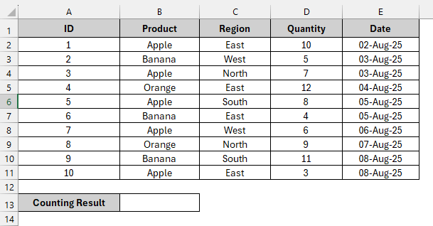 In the following dataset, we have a simple product details dataset. Column A lists the Product ID, Column B contains the Product Category, Column C shows the Region of the product, Column D holds the Quantity of the Product, and Column E includes the Order Date.
