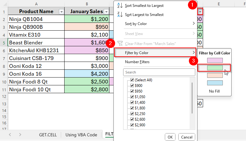Though the GET.CELL function allows you to use the SUMIF function, this method is a little bit of a hassle while there are some other simple ways to sum values by cell color. For example, you can use a VBA code or apply the FILTER + SUBTOTAL functions instead. These are pretty much straightforward than the GET.CELL function. Â