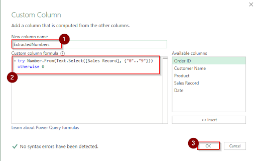 ➤ Name the new column “ ExtractedNumbers” and write this custom column formula :