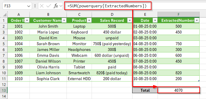 A single column can contain numbers, text, and text with numbers in an Excel worksheet. Such as 500$, 450 dollar, 750$ (paid yesterday), or even words like unpaid. Excel understands them as text, and the regular SUM function won’t work. Using Power Query, VBA, or even quick manual tricks to extract and sum only the numeric values, we can sum numbers.