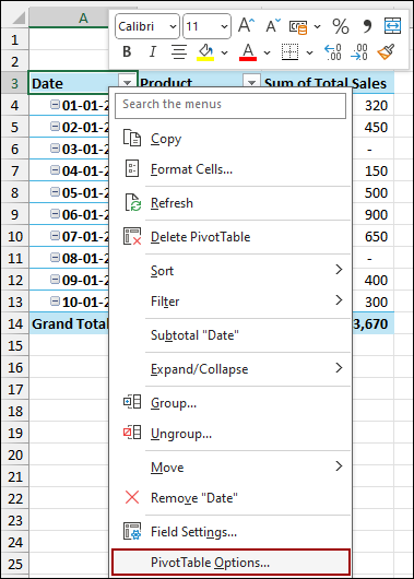 ➤ From the context menu, select PivotTable Options.