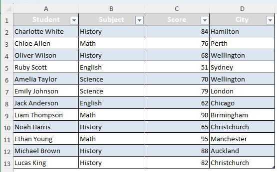 To demonstrate how to rank in a pivot table, we have a data table and a pivot table that we will use to apply the ranking methods. In our table, we have the scores of some students, the subjects they scored in, and the cities they live in. We want to rank the students based on their scores. Here are the methods to do that: