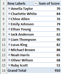 ⤠The score is in the value field as Sum of Score. Click on it and select Value Field Settings.