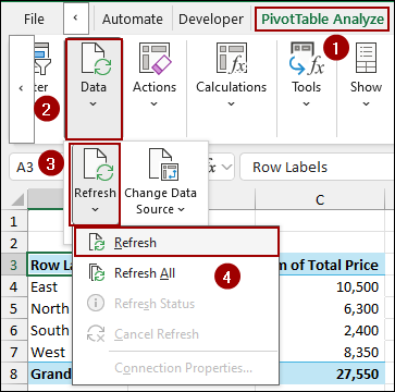 ➤ Coming back to the Pivot Table sheet, go to the PivotTable Analyze tab and click Refresh in the Data group.