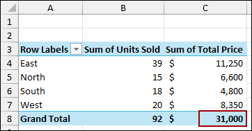 Finally, you will see that the PivotTable has been updated with the new data, and the Grand Total is now $31,000.