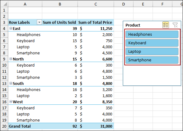 Now, let’s apply a filter using the Slicer. Here, we have deselected the Keyboard and Laptop using Slicer. Thus, the Pivot Table has removed all the data for the Keyboard and Laptop sales.