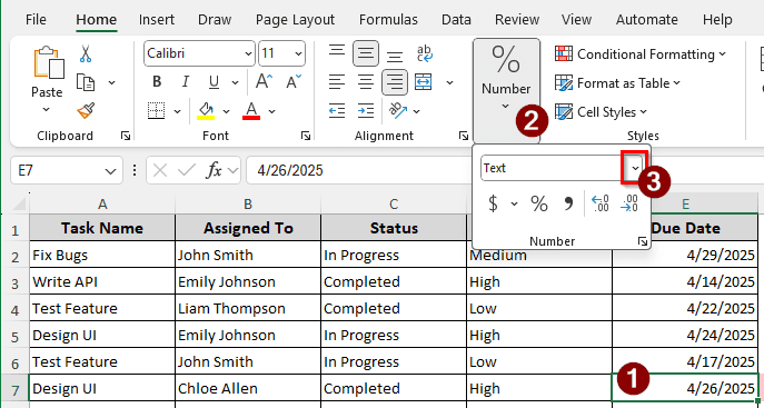 ➤ In E5 and E9 cells, we can write the correct date. But in the E7 cell, the issue is a bit more complicated. The date is written here properly, but the cell is formatted as text. We need to change it back to “Date”.
