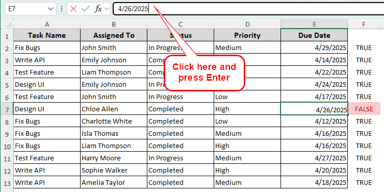 ➤ Even after doing that, the F7 cell won’t turn to TRUE. That is because Excel still hasn’t registered the change.