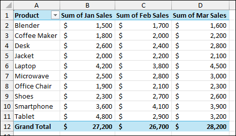 A new column, Sum of Total Sales, added to the Pivot Table, displaying the three-month sum for each product.