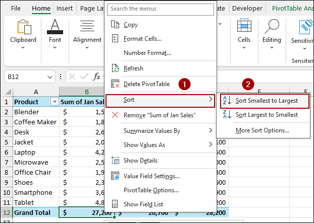 ➤ Right-click on the Grand Total cell for the first month (Sum of Jan Sales, cell B12).