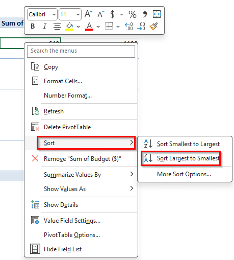 As a pivot table sorts only by the fields, you cannot just randomly select a cell and ask it to sort. That way, the sorting won’t be what you want. Here is what you need to do: