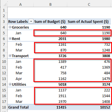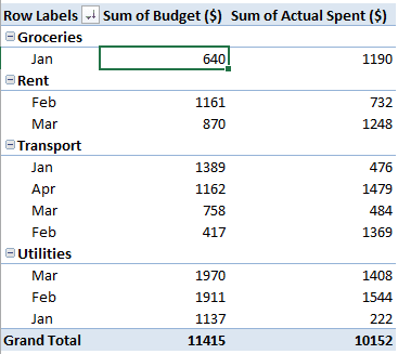 We have a dataset here with some financial data. There are the budgets for each category and month, and there are the amounts that were actually spent. We want to sort it from largest to smallest to know the largest budget amounts that were set against the spent amount. Follow the steps below to sort the pivot table: