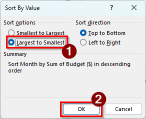 ➤ You can also click the Sort button directly to choose advanced sorting options like below. Select the options you like and press OK afterwards. We are selecting Largest to Smallest and pressing OK for this example.