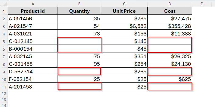 However, here we’ve a dataset including Product Id, Quantity, Unit Price and Cost. To find out the total cost, we have multiplied Column B with Column C. But there are some cells including 0 in column B and when we multiply, the results in column D are also 0.