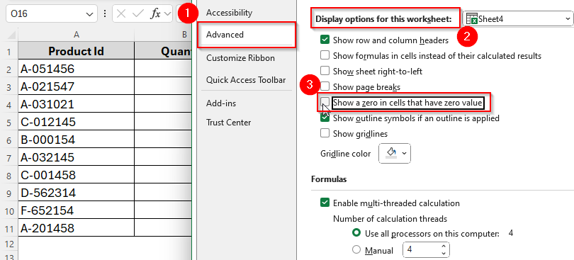 Hide Zeros with Excel Settings to Leave the Cell Blank